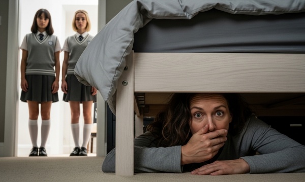 The sound of creaking floorboards on the stairs was the only thing breaking the silence after Lily’s whispered command. One, two, three pairs of feet. Maybe four. Each step echoed like a hammer blow to my nerves as I squeezed my eyes shut, trying to become invisible under the bed frame.